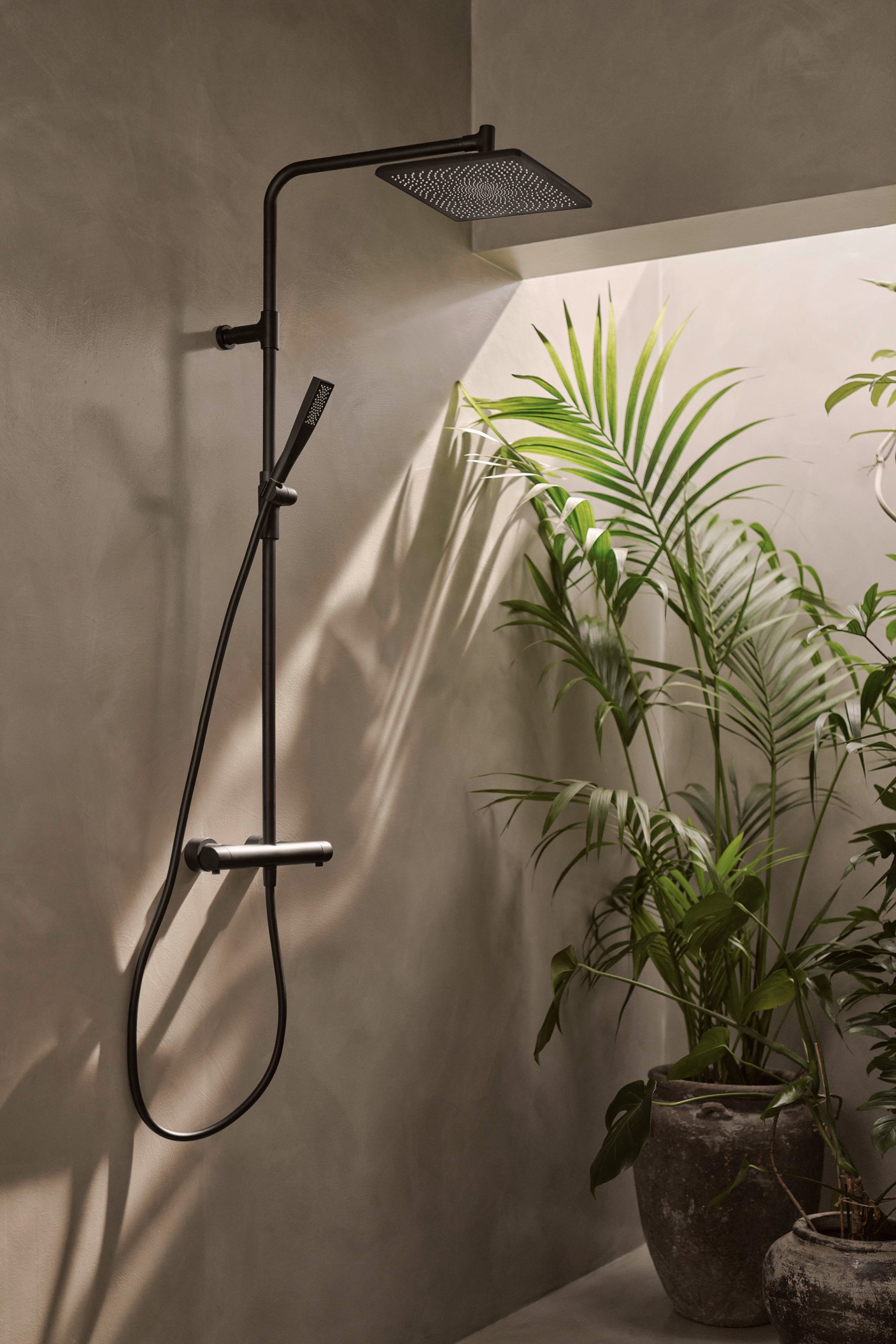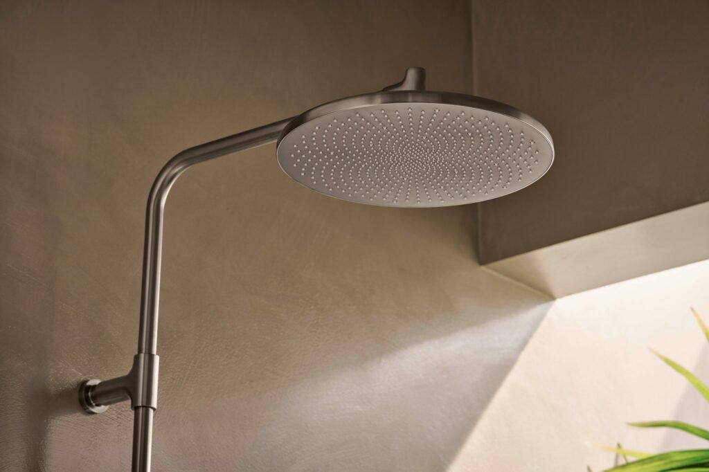 Was bei der Handbrause bereits im Kleinen umgesetzt wurde, zeigt sich bei der großen Kopfbrause in voller Pracht. Die Düsen sind in Form von Lotusblütenblättern angeordnet: Das Zentrum bildet einen dichten Wasservorhang, der am Körper entlang rinnt und ihn somit wärmend umhüllt, die Blätterblätter tragen das Wasser nach außen, kommen aber mit weniger Düsen aus. So wird das Duscherlebnis zugleich intensiviert und optimiert. Die Kopfbrause steht entweder mit einem Durchmesser von 300 mm in runder Form oder mit 250 x 250 mm in quadratischer Form zu Verfügung.