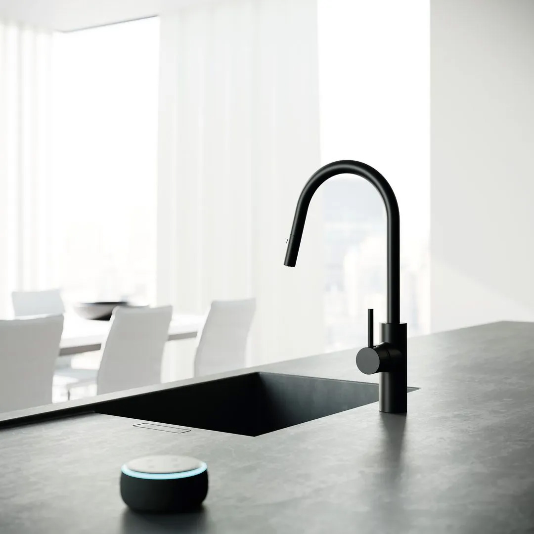 Die zunehmende Digitalisierung des Alltags hat längst auch die Küche erreicht. Nicht nur grundlegende Funktionen der Haustechnik wie Licht, Heizung oder Verschattung lassen sich hier digital vernetzen, sondern darüber hinaus werden auch Küchengeräte und Kochutensilien selbst smart. So kommuniziert etwa die smarte Dunstabzugshaube mit den Kochfeldern, um abgestimmt auf den jeweiligen Kochvorgang ihre Leistung selbst zu regulieren. Oder die vernetzte Pfanne wiegt die hineingegebenen Zutaten automatisch ab und überträgt die Daten samt Informationen über Nährwerte und Kalorien auf Smartphone oder Tablet. „Bislang war in der digital vernetzten Küche die Spüle eine letzte ‚analoge Insel‘“, erzählt Leonardo de Muro, Group Marketing Vice President.  „Wir machen jetzt auch die Küchenspüle smart.“ Möglich wird dies durch die Weiterentwicklung der weltweit ersten hybriden Küchenarmatur Kludi-E-GO zu Kludi-E-GO Voice.